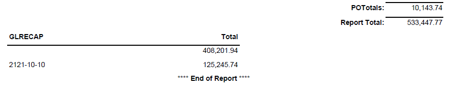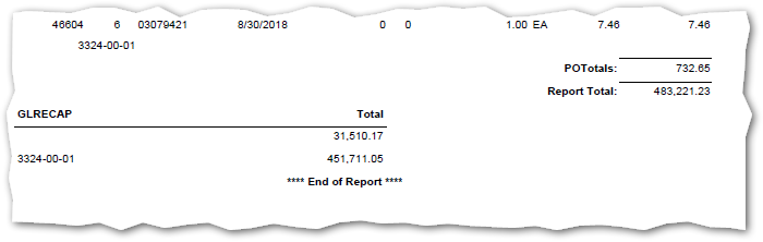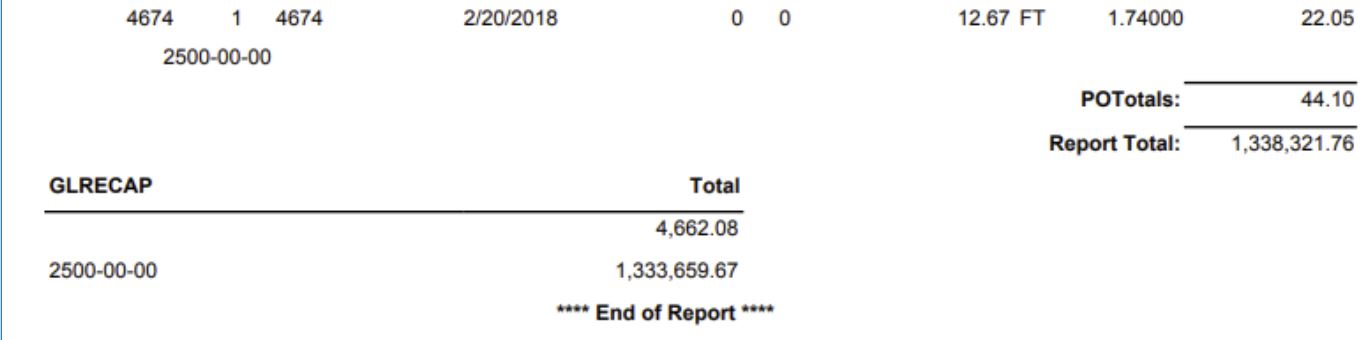 On a new implementation, our Received Not Invoiced report shows an incorrect/incomplete GLrecap at the end. Instead of a regular double-sided entry showing the GL accounts with amounts adding up to the report total, it only shows one half of the entry and the amounts don’t match the report total.