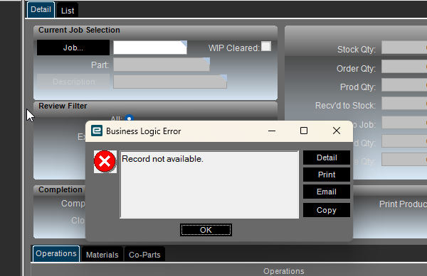 ## System Information ## ================== AppServer Connection: https://e11prod.company.com/E11Prod Form Name: Job Completion/Closing Maintenance Customization Name: Menu ID: JCGO3004 Software Version: 11.2.300.12 ============ Business Layer Exception Record not available. Exception caught in: Epicor.ServiceModel ## Error Detail ## ============ ##!Correlation ID:##! dedaff11-b5c7-42f2-8d01-a6d27a8185f7 ##!Description:##! Record not available. ##!Program:##! Erp.Services.BO.JobClosing.dll ##!Method:##! JobOperAfterGetRows ##!Line Number:##! 2007 ##!Column Number:##! 9 ##!Table:##! JobAsmbl ## Client Stack Trace ## ================== at Ice.Cloud.ProxyBase