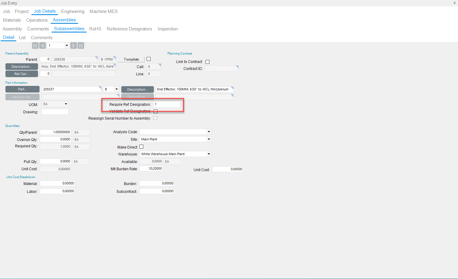 I have a Job that is giving me an error when trying to release “Assembly 0 - SubAssembly 1 for Job BR43209-02 does not have the required quantity of Reference Designators.” I am not able to change the "Ref Designator to 0, when I hit save it just changes back to 1. I’ve checked all the parts and their methods, nothing has a 1 for the ref designator. What else would cause this?