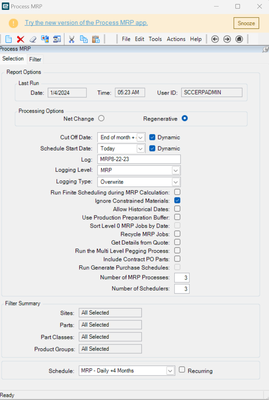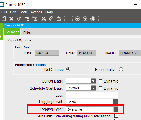 Apologies, this is a new Process MRP. Everything is the same (I just submitted it this morning) except the Log name is now “MRP_LatestLogFile”. All of our MRP runs have been set to Overwrite however.