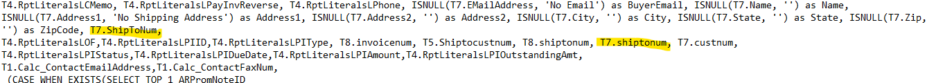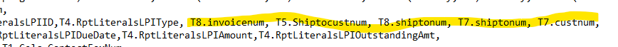 T4.RptLiteralsLOF,T4.RptLiteralsLPIID,T4.RptLiteralsLPIType, T8.InvoiceNum, T8.ShipToNum, T7.ShipToNum, T7.CustNum,