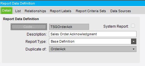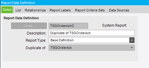 I went into Report Style Maintenance, and changed the data definition in the original report style from TSGOrderAck (shown in this pic) into TSGOrderAckC (the duplicate I created above)