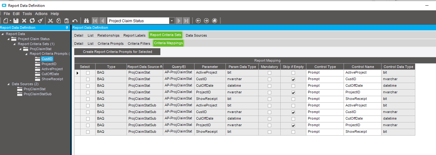 I have created a RDD BAQ Report. The RDD has a few Report Criteria Prompts. I have default the value to Empty string for CustID and ProjectID. In the BAQ, CustID and ProjectID has the check box ticked for “Skip if Empty” so that I get results when they are Empty.