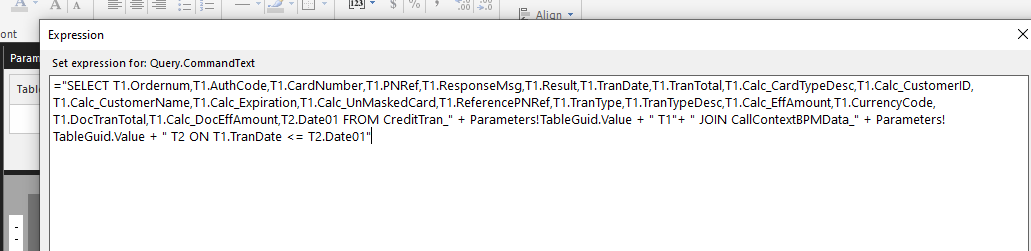 - In the copy of your CC Report RDL, edit the Query expression for dataset CreditTran. Add the highlighted parts below: