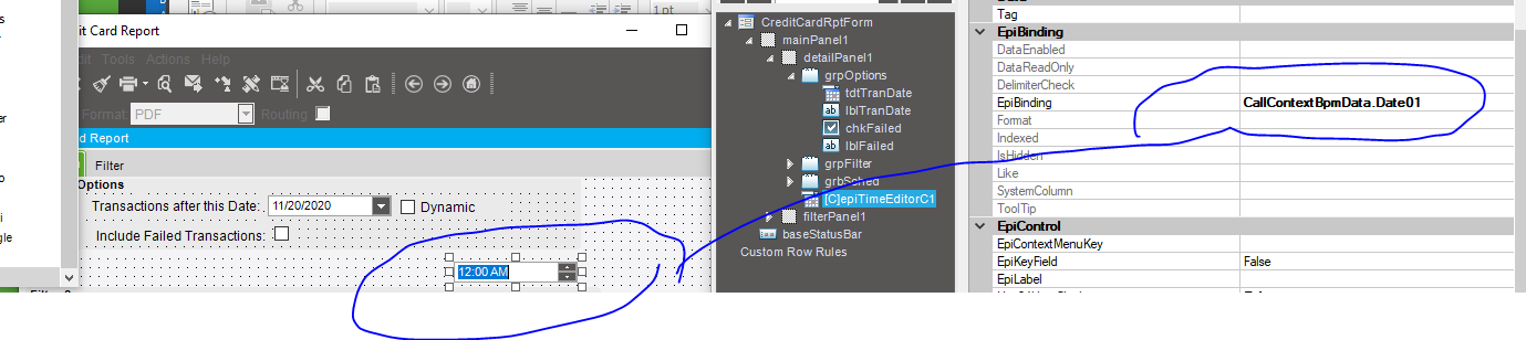 - Customize the Credit Card Report form, adding a date control. Bind it to