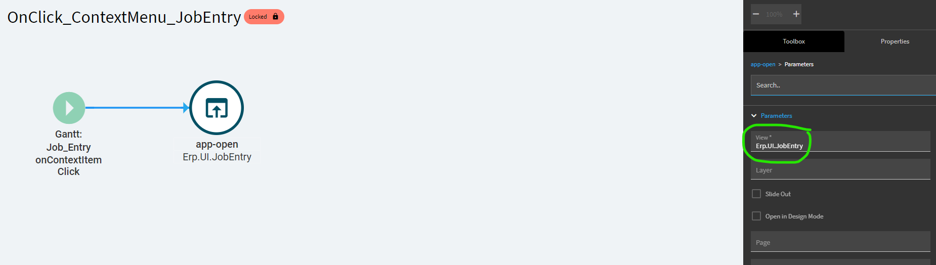 The base event is calling the app-open… and targeting Erp.UI.JobEntry… which again, is technically correct. WHY its opening a tracker menu by default, I have no clue.