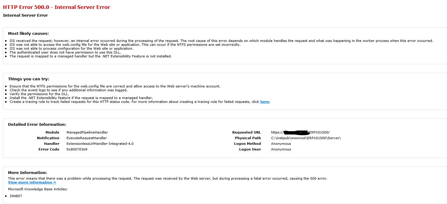 Trying to set up REST. IF I use https://my server name, no error. If I use https://my server name/ERP101500, gives me an HTTP Error 500.0