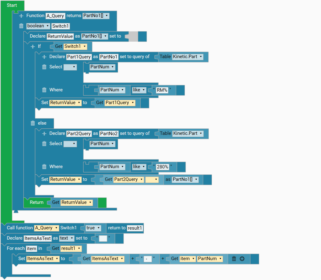I have a Query of a Table in CPQ. I declared the variable using the first column name (PartNo). In order to get the entire column, I did not specify distinct, first or top. I get the result I want but it looks like this: