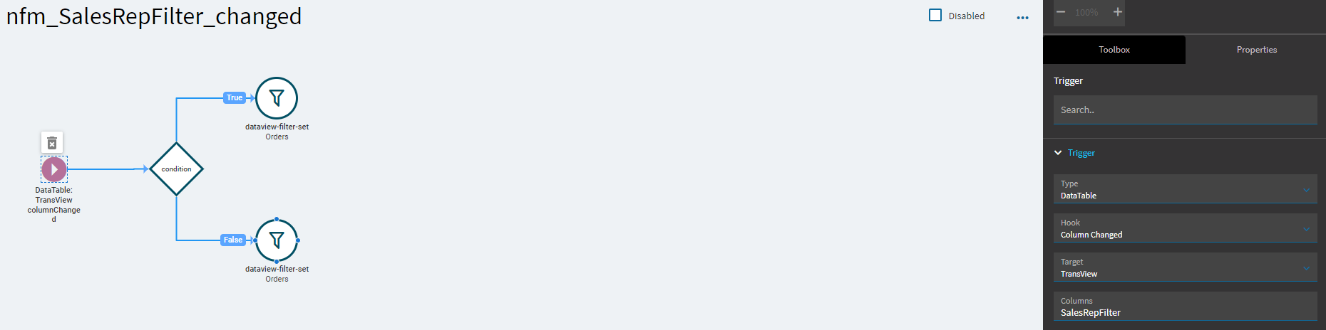 If FALSE… then I filter the target dataview (“Orders” in my case):