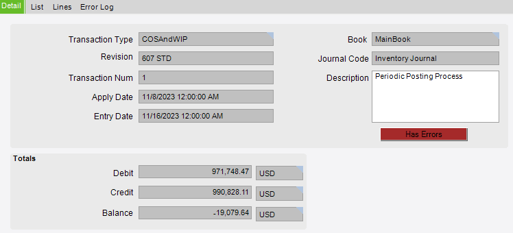 I suggest cancelling the review journal and then running the Inventory/WIP reconciliation report for 11/8 (the apply date) to see if the GL summary balances. You most likely have a missing GL Control code.