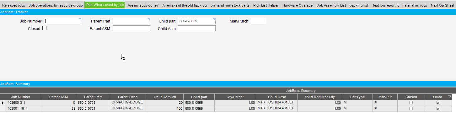 A tool that I have made that has proved invaluable is a dashboard that shows all of the jobs that parts are on. We make nearly everything on a make to order job. It’s a great starting point when looking for anything. Great for revision changes, looking for BOM issues, etc. Plus, you can’t search a job for a material part number, and this lets you do that.