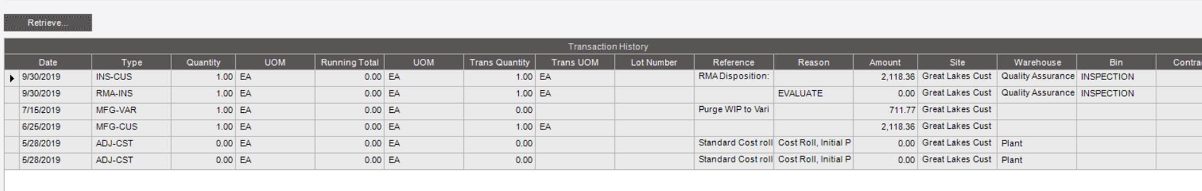 Here is my part transaction history. None of this shows up on the WIP Reconc. nor does it show up on the general ledger. I just assumed if mfg-cus shows on WIP that the ins-cus would also as it does show a value going out… My WIP reconc