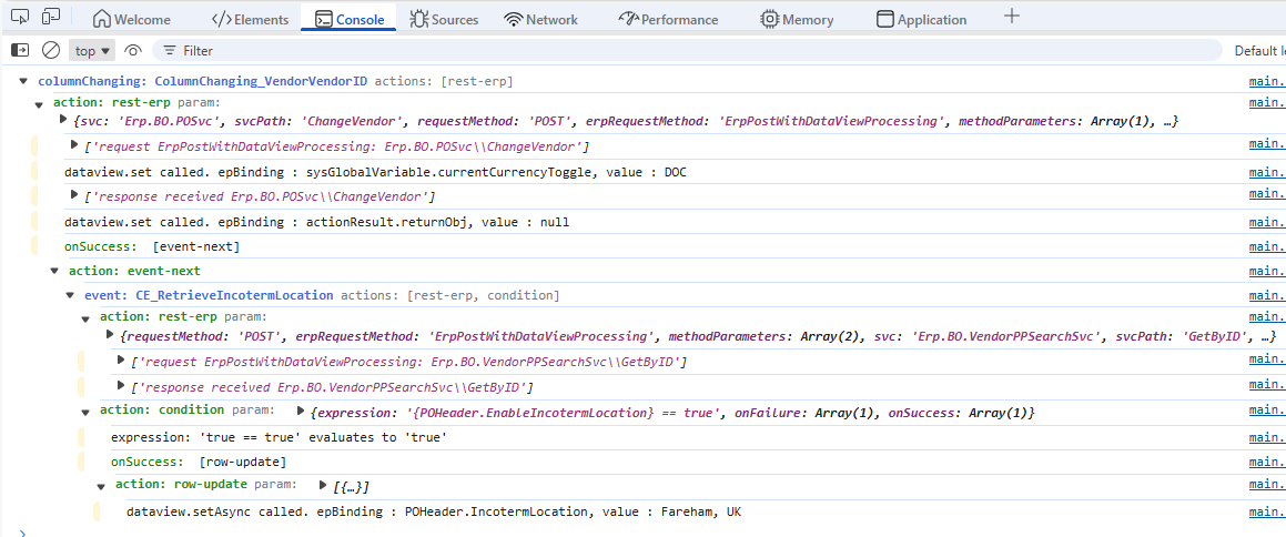 Trying to complete a basic customization for PO Entry, I am about 90% of the way there, however a basic row-update widget seems to be triggering some sort of continuous loop causing the browser to freeze. The short version of the customization is that in PO Entry, I’m doing a basic event to populate the Incoterm Location text box, based on the Incoterm location saved in the Vendor Purchase Point table for the PP being used in the PO. The ultimate goal is simply to save users from entering the same info for each PO to the same vendor/pp. My event is being triggered each time the vendor ID changes or Purchase Point changes. My event does a simple rest-kinetic call to Erp.BO.VendorPPSearchSvc → GetByID, the response goes into the actionResult dataview. So far, all of that works as expected, confirmed with a trace. I then have a condition to understand if LocationEnabled = true, and if so, I am trying to populate the IncotermsLocation field via row-update. When the row-update executes, it causes the browser to freeze, if I wait long enough, I get the “Long Running Process” slideout. I’ve tried the following with no luck: