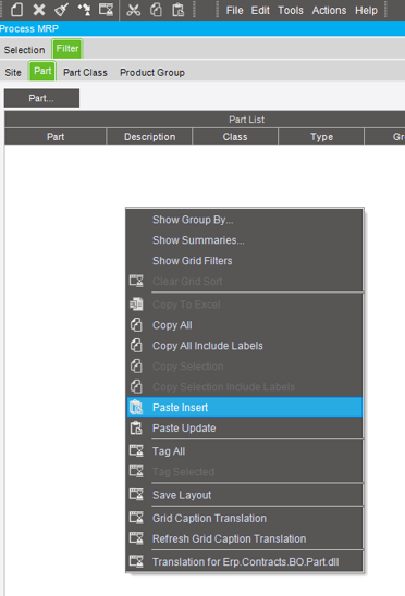 I have to run MRP for a set of about 60 parts. I have them on my clipboard. Is there a way on this screen to paste them in?