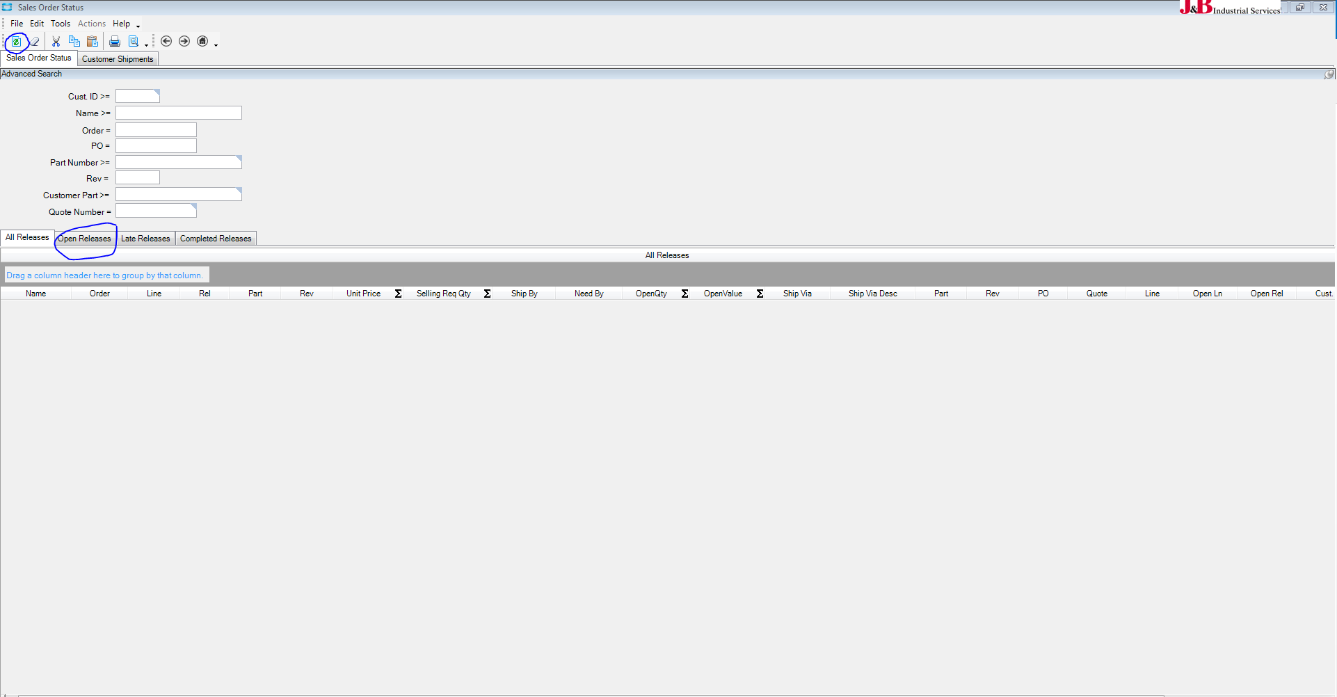 We have just one user who cannot get data to display in the Sales Order Status Screen. They click the Open Releases Tab, and the screen refreshes, but no data shows. On my machine, it works fine. We are running Epicor 10.0.700.4. This just started happening to this user today, and all other users are having no problems with it.