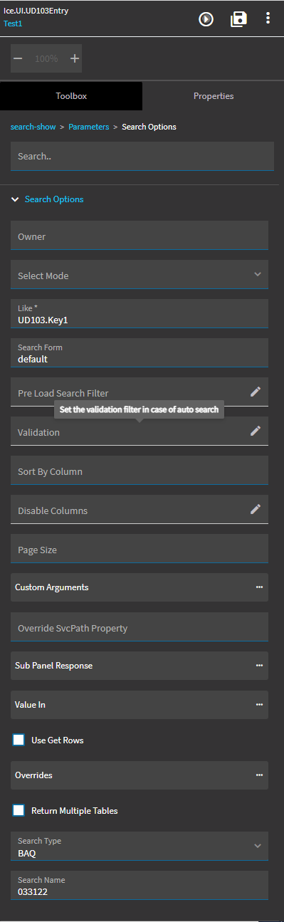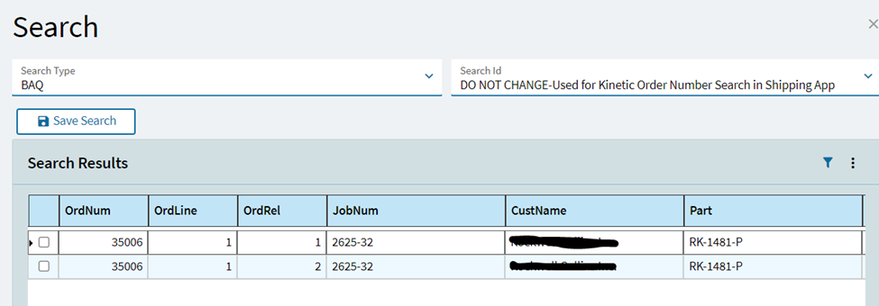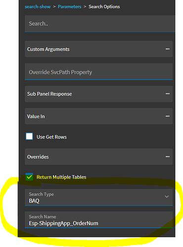 I have populated the search-show > Parameters > Search Options > Search Type = BAQ and Search Name = my BAQ name. I wasn’t sure if I should check “Return Multiple Tables but have tried it checked and unchecked…didn’t make a difference.