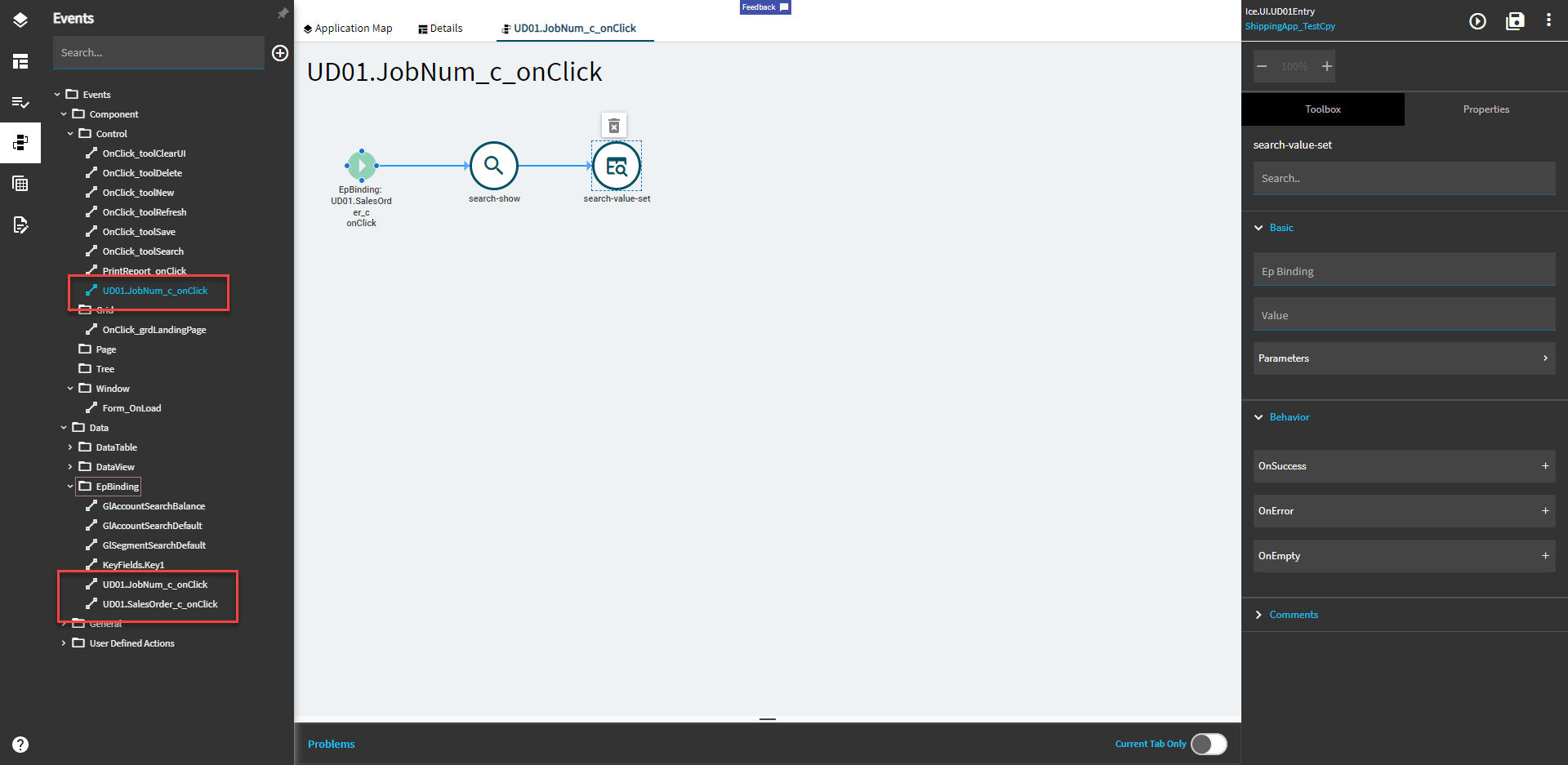 Okay, so the first thing I see is you have multiple events which is why you have multiple searches coming up. I got rid of all but the SalesOrder_c_OnClick.