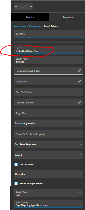 When I test the search it appears to use my BAQ as I am prompted to enter my parameter, which is a Sales Order Number and I can then select from the rows returned. The data fields showing in my search are the fields returning in my BAQ.