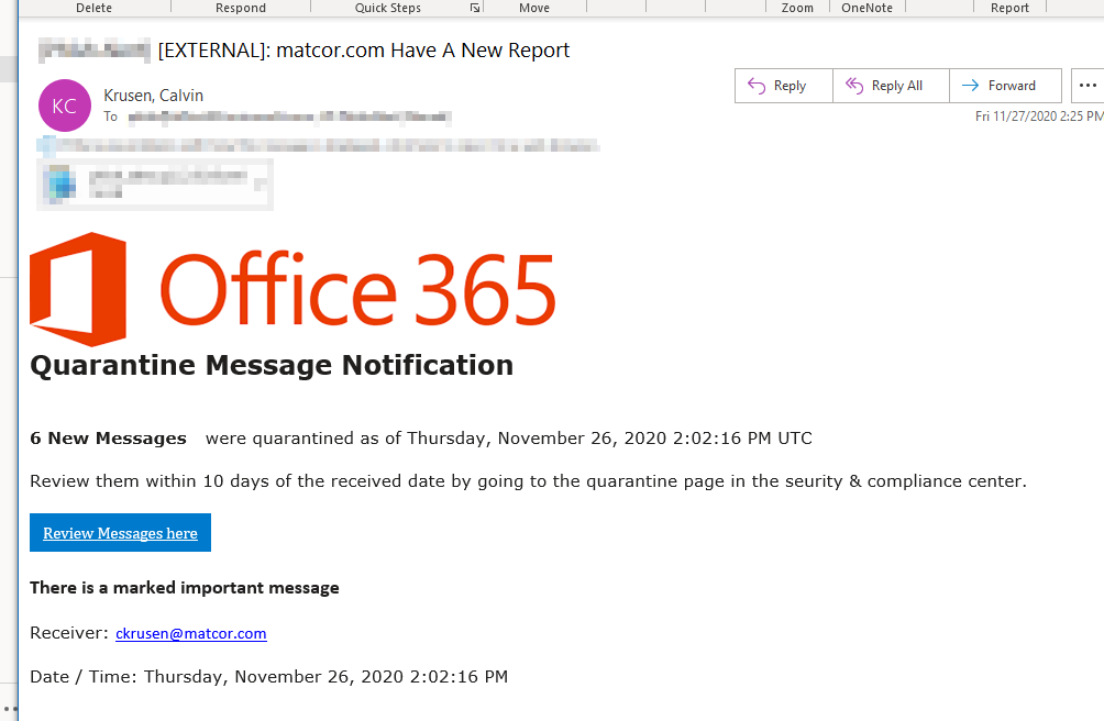 I’ve used other corporate mail systems that use external mail filters. And the source of their messages about quarantined (possible spam) is from outside our domain. I think the above phishing attack might be more successful had it said that mail messages were being held up as possible spam. The word “quarantine” got my spidey-senses tingling.