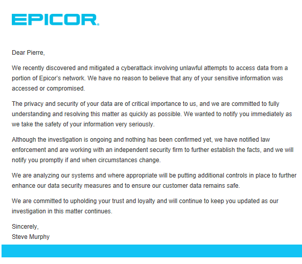We recently discovered and mitigated a cyberattack involving unlawful attempts to access data from a portion of Epicor’s network. We have no reason to believe that any of your sensitive information was accessed or compromised.