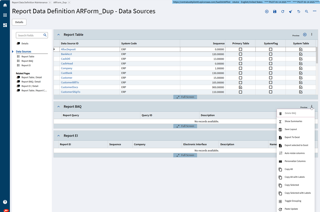 The combination of these two gaps is what drives people to hit the db directly. If you could add the same system table twice, and/or you could combine tables and baq data sources within a single rdd, there would never be any reason why you would NEED to hit the db. But unless you want to build system reports from scratch with a baq data source (and who has time for that, especially when its something super complicated like a traveler or invoice?) sometimes there really is no other choice.
