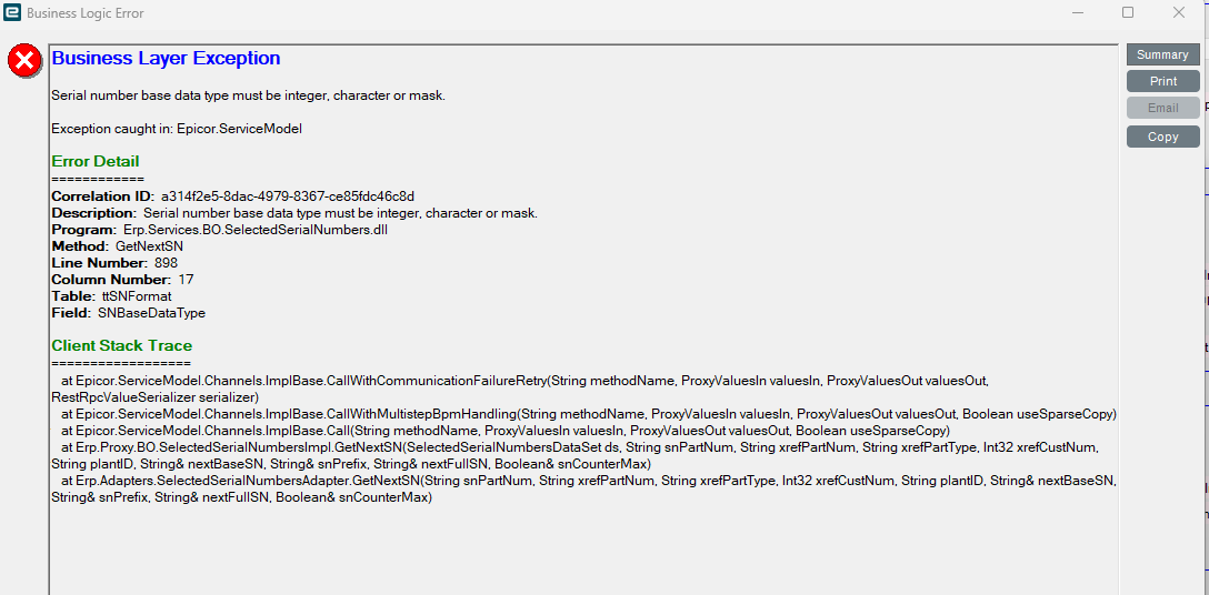 You should check the serial number configuration on the part at the Company level (Part Maintenance menu => Part tab => Detail tab => Track Serial Numbers checkbox and S/N Format button), then, if it’s still giving you errors, also check it at the Site level (Part Maintenance menu => Part tab => Sites tab => Detail tab => S/N Format button).