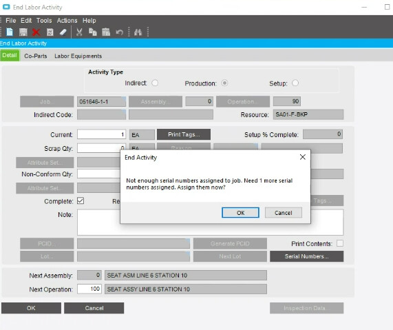 job is for qnty 1. 1 serial number is assigned and completed up to op 90. when trying to complete op 90 it is asking for another serial number.