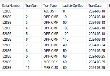 select * from erp.sntran where jobnum = ‘051646-1-1’ and partnum = ‘jobpart’