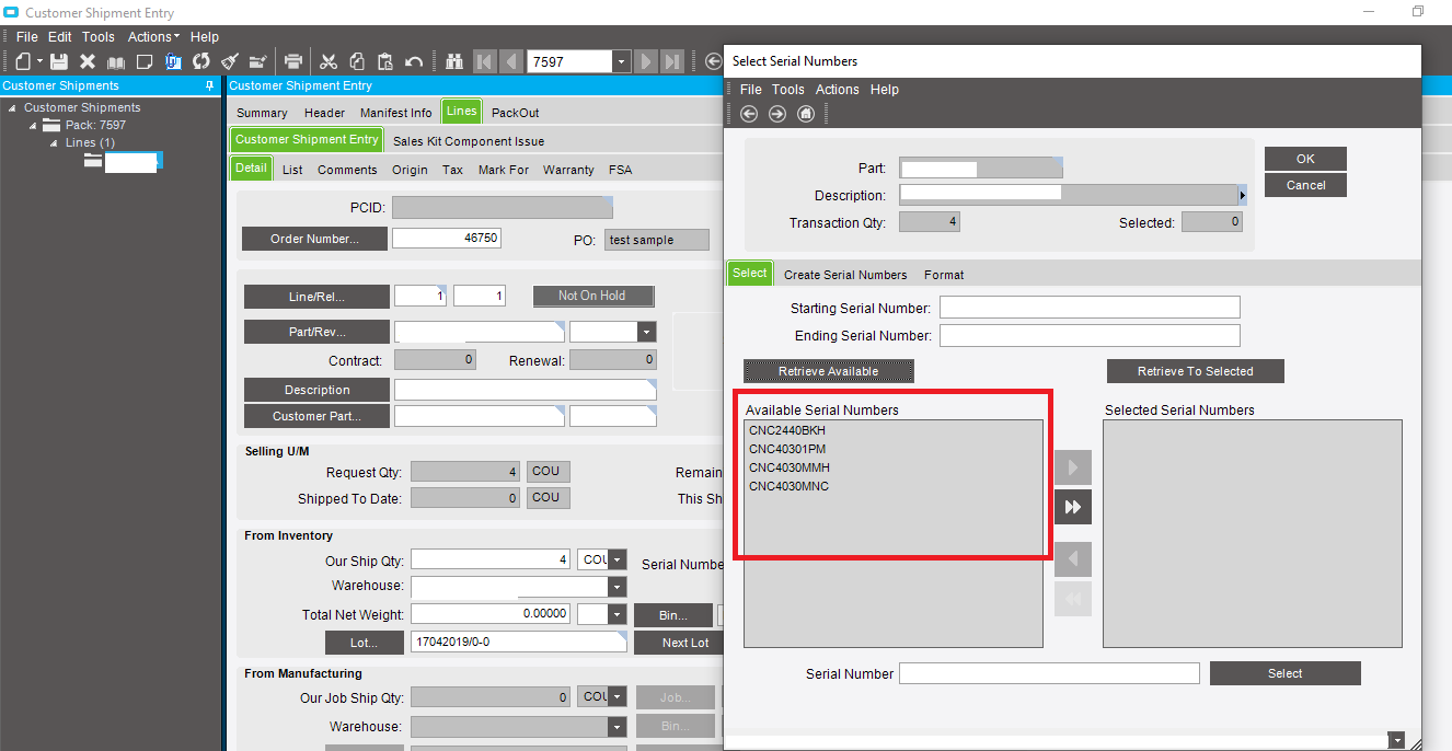 Now I’m doing a little exploring to figure out how it works. I have the mask set up, and turned on a for a part number. I see how the shipping works with the serial numbers, adding them (we will be adding them at shipment). So far so good.