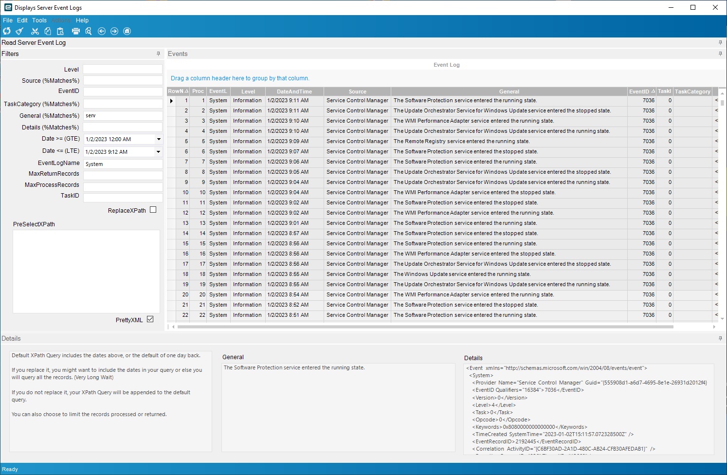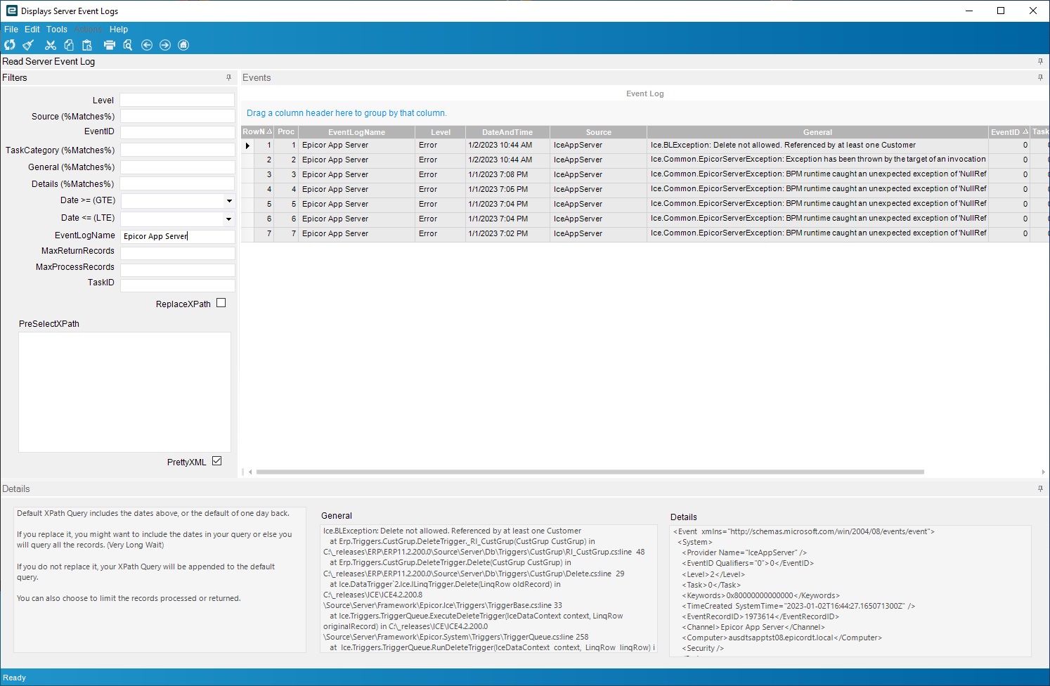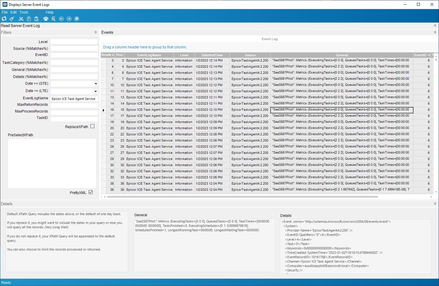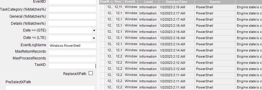 List<ResultsUbaqRow> eventRecords = GetEventLog(EventLogName, xPathPreSelect, ReplaceXPath, PrettyXML, logDateGTE, logDateLTE, whereClauseFunctionDictionary, excludeFields, MaxRecordsToProcess, MaxRecordsToReturn);