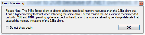 Maybe the reason behind the Epicor.exe 32 bit client by default is restricted memory allocation per client, specially if all users run Epicor client from a single server (via RDP/Citrix).