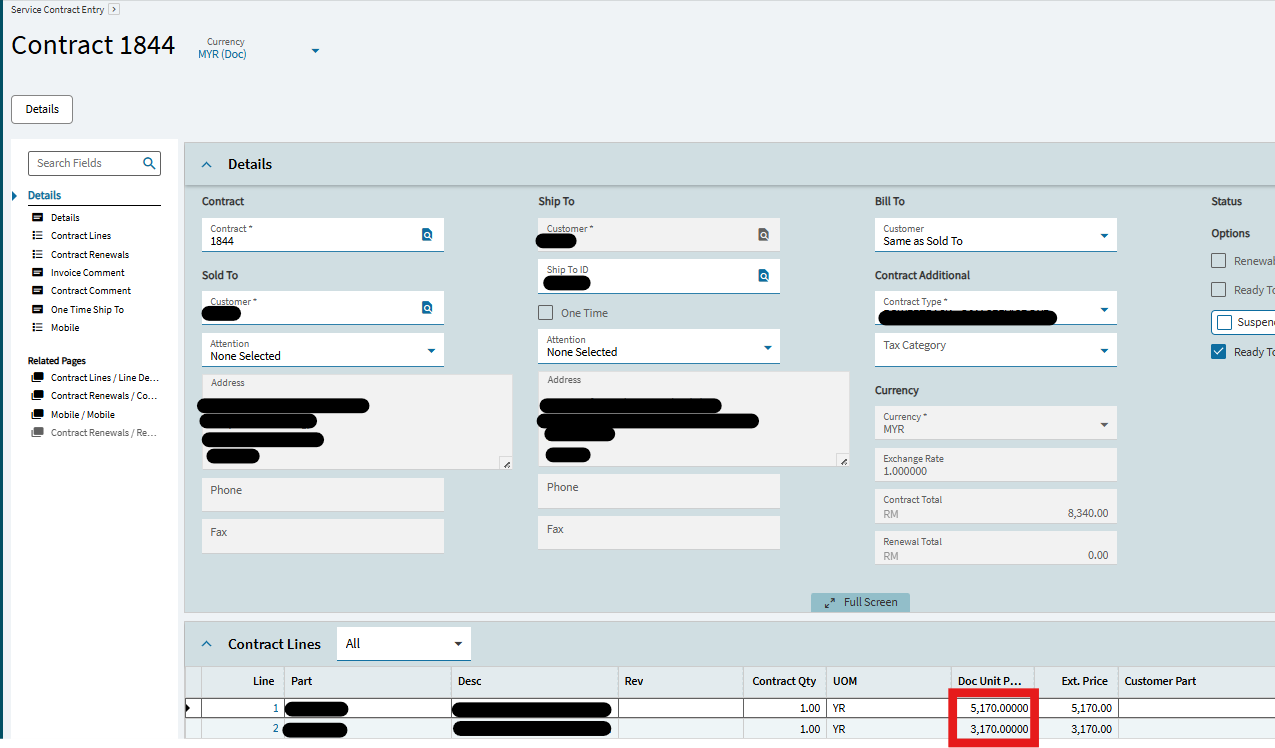 The Contract Billing entry contains two separate lines, each with its own quantity and amount. However, when the AR Invoice is created, Epicor automatically combines both contract lines into a single invoice line with the total amount.