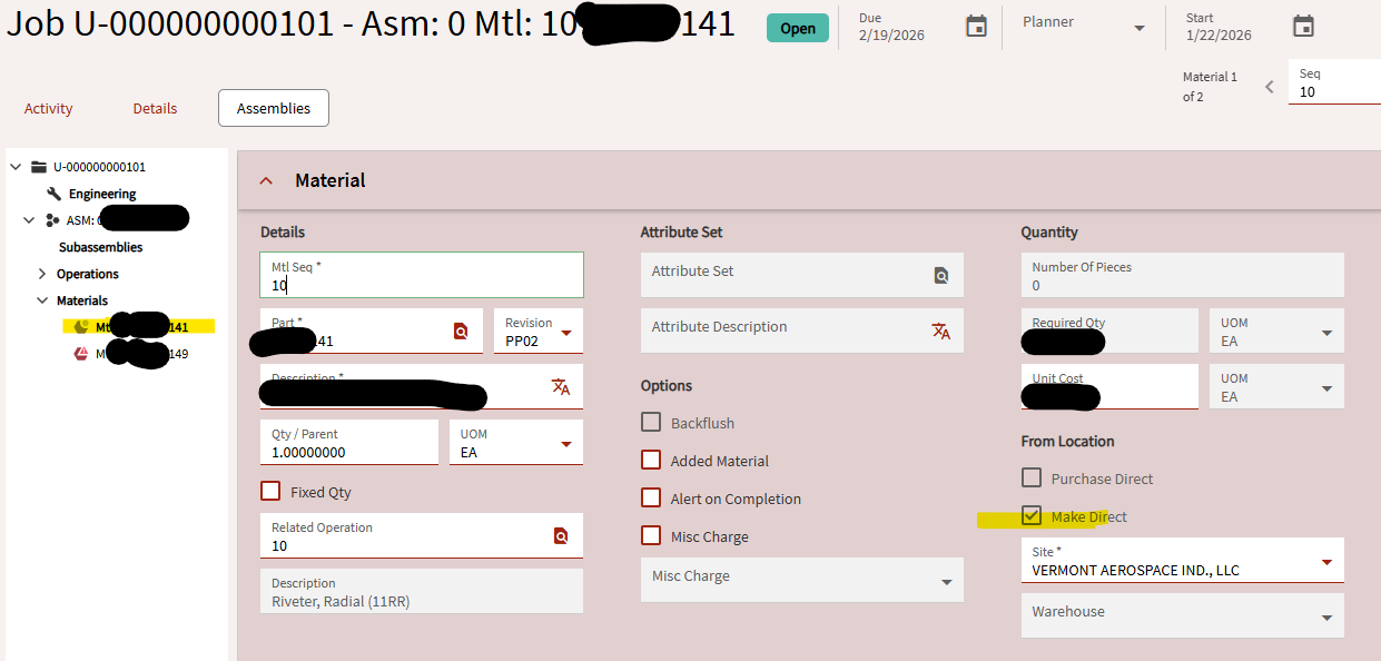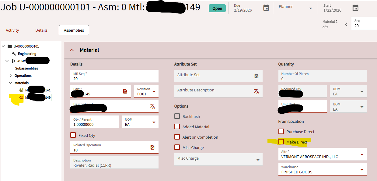 You can see in this screenshot from Job Entry that the second material is flagged with a weird icon, and the make direct isn’t checked.