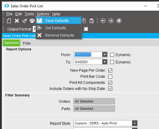 My users didn’t have the Actions->Save Defaults enabled on the reports. I am searching which option I need to allow on User Security for users to be able to have that enabled hopefully not giving more power than they should have in other areas of the application.