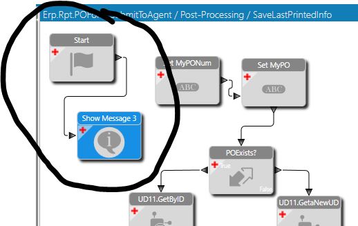 I have a post-processing Method Directive based on Erp.Rpt.POForm.SubmitToAgent. I am trying to capture the event when a user clicks “print” in a PO to print or export the PO for the vendor. My other widgets in the BPM are firing, but I can’t get even an empty Show Message to appear. Even just going from Start > Show Message = “Done”, will not work. When I try this, the BPM finished, but the message never shows. I can tell the BPM finishes because part of it is adding a new record to a UD table. The records are getting added, but the Show Message never shows. Is this blocked in method directives? What else would cause a Show Message to not show inside a method directive BPM?