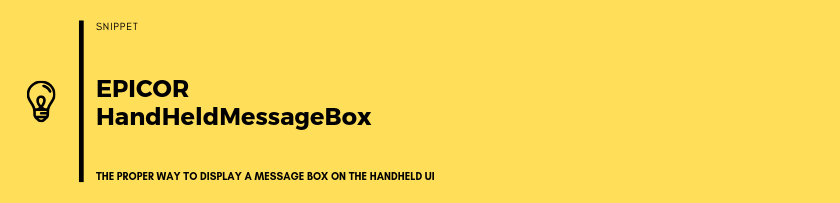 Epicor Framework comes with a special helper method to display Message Boxes on the HandHeld UI properly within, it is the same size as the HandHeld UI and it can not be missed. You can use this Helper on any Form. It requires no dependencies.