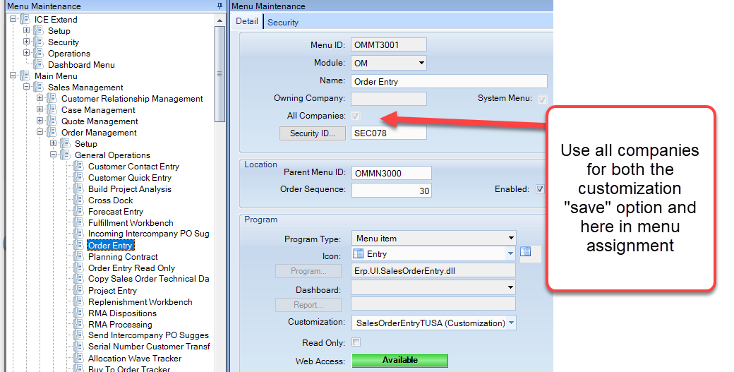 Ex: Menu itemOMMT3001changed fromOrder Entry (SOE_07)(our 10.1.400 setting) ->Order Entry - Built-in menu items are all now ‘All Companies’ and cannot be unchecked.