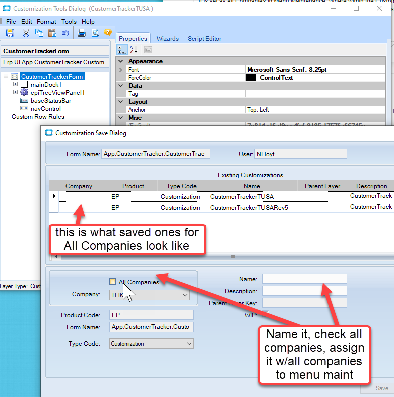 It is set as All Companies in Menu Maintenance. Where within the Customization Tools Dialog do we save the option as All Companies? I also did not see an option in the Customization Maintenance screen also.