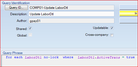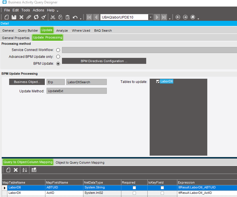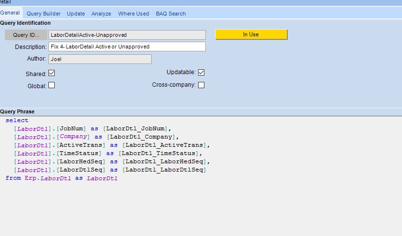 i know this is an old issue and i have tried looking for the BAQ that helps me get around this 10.0.700.2 bug. I created an updateable BAQ using LaborDtl (maybe that’s my problem) while following countless videos on how to make a BAQ updateable. On my BAQ i have the active trans checkbox which can be changed in my dashboard but, like every other updateable field, i cant save the change. I am trying to change the TimeStatus on jobs that i am unable to close due to the error mentioned in the beginning of this post. i have taken some screenshots hoping someone can point out my mistakes.