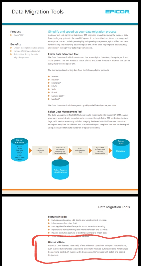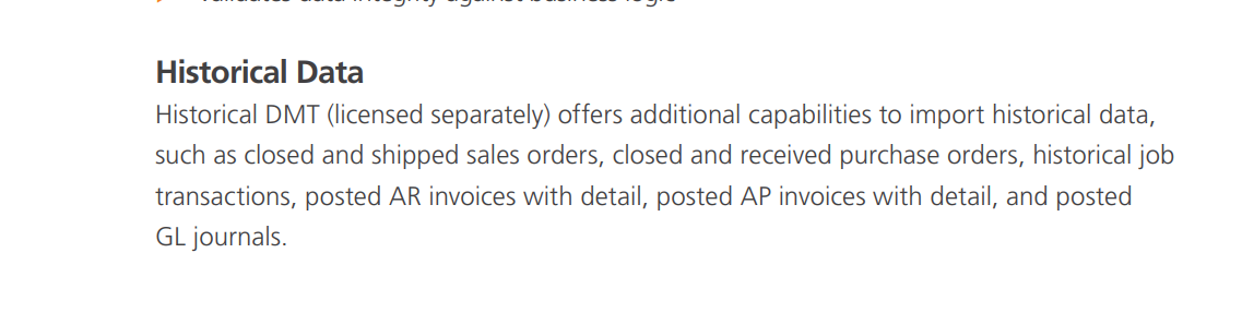 Historical DMT (licensed separately) offers additional capabilities to import historical data, such as closed and shipped sales orders, closed and received purchase orders, historical job transactions, posted AR invoices with detail, posted AP invoices with detail, and posted GL journals.