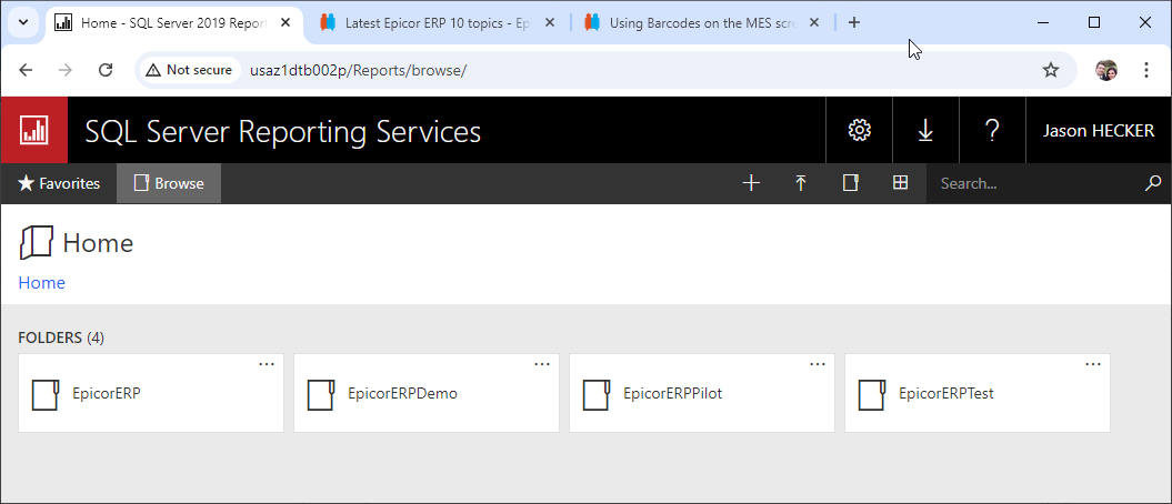 The EpicorERPTest folder is exactly the same as the other 3 Epicor environment folders (in regards to security) so I am at a loss of where else I need to look. Just for grins-n-giggles, I added my account to the users for the ReportServer and EpicorERPReports databases, which made no difference either.