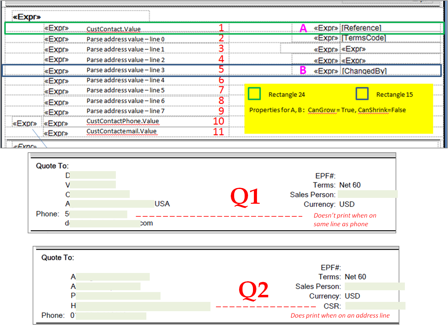 How do we ensure that the CSR fields is always printed, no matter how it lines up with the address block? All the CanShrink properties are set to False and the ChangedBy field is populated for every record.