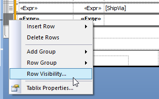 Row in this case means the row of the table. If you click into the blank space to the left of the textbox with the expression it should select the row. You can right-click the row block and check the visibility settings from there.