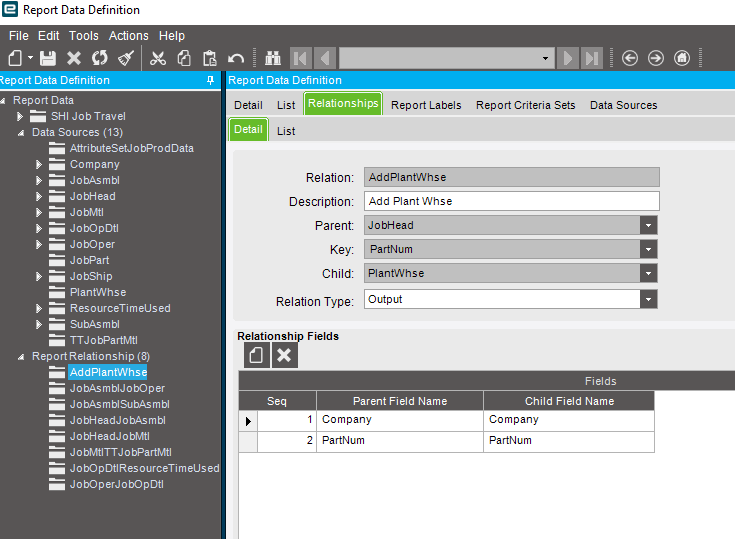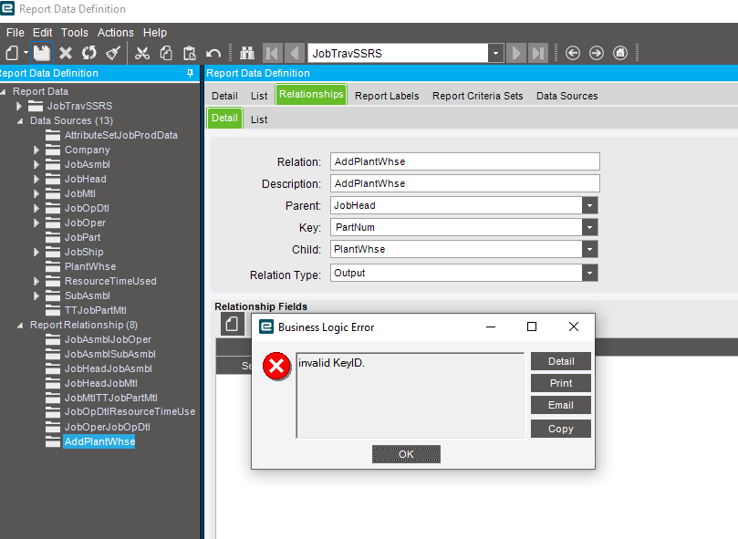 I have a plain JobTrav RDD here that I copied from the original. I was able to create the PlantWhse data source, but when I go to add the relationship, it says the key ID is invalid.