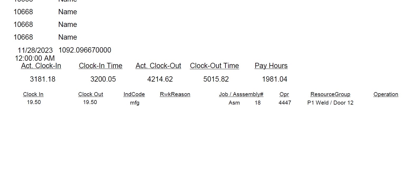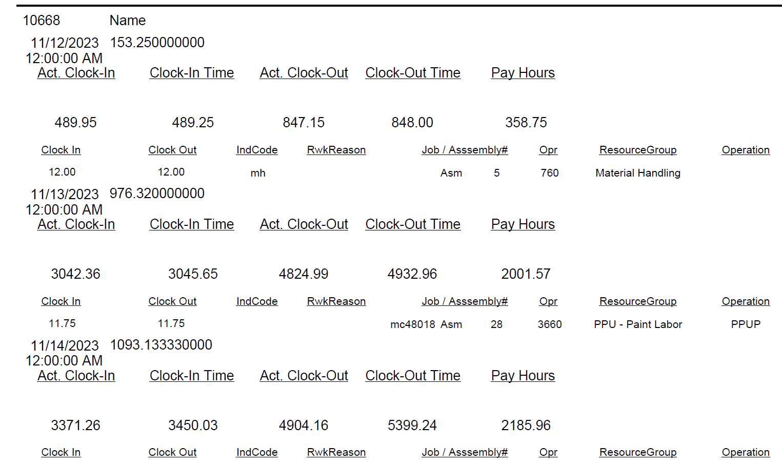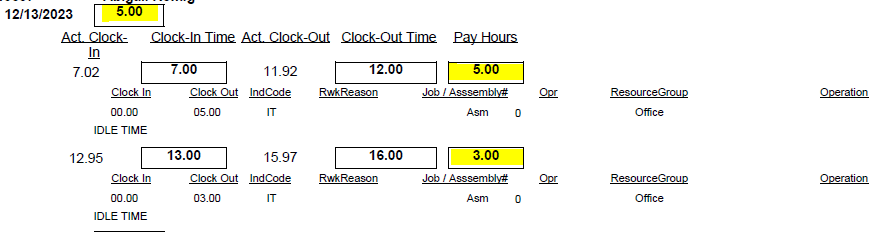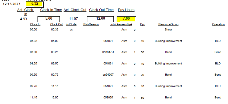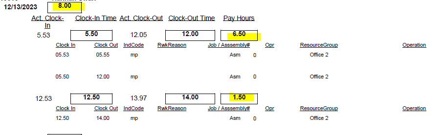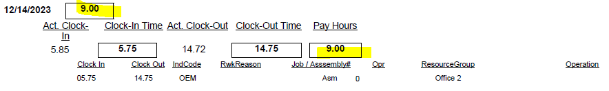 Here in this first picture, the pay hours should equal to that top number, supposed to be total labor hours. In this example, the numbers should be the same. However the reason the field isn’t duplicated is because in the first example, that person did not clock out at all. They smaller clock ins/outs are for jobs. They do one job then move to the next but still clocked in on the job, just different tasks.