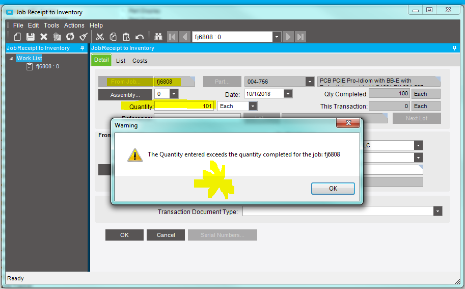 The following pop up occurs when you try and move more than the Job Completed into Inventory.