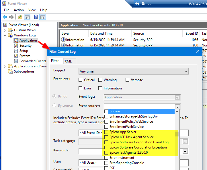 Here’s a screenshot of Event Viewer on our App server. Note the number of entries with “Epicor” in the name of the Event Source: