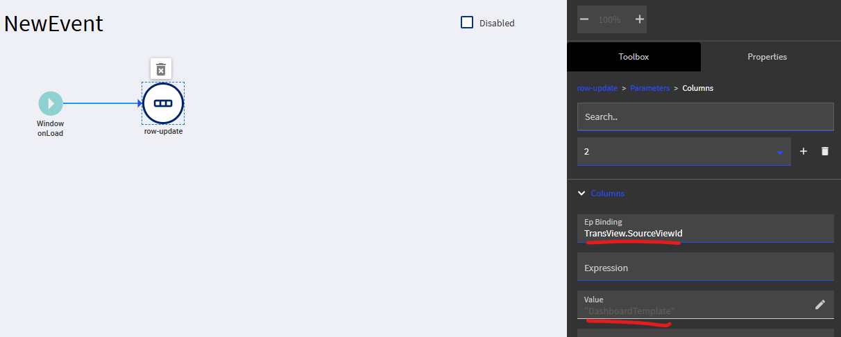 - Add the required search fields in the Filters grid, binding each one to a column in the SearchFilters view (create a column for each one, e.g. SearchFilters.EmployeeID). In the labels, indicate the type of search, e.g. Project ID (starts), Close Date (from), etc.