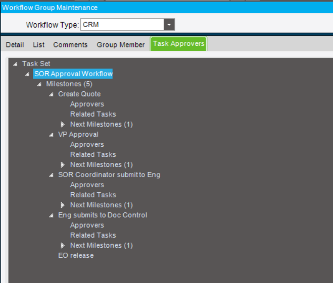 Thank you Ernie. I created a workflow group and associated it with the task set I created but it still seems to be doing the same thing. I see a drop down menu for “approvers” under each task in the workflow group maintenance module but it’s not populated with anything. I’ve added 5 group members with the role code associated with the task, but I’m still getting the same thing - when the primary salesperson completes the first task, it auto-defaults back to them, and the other group members are unable to complete the next task in the sequence.