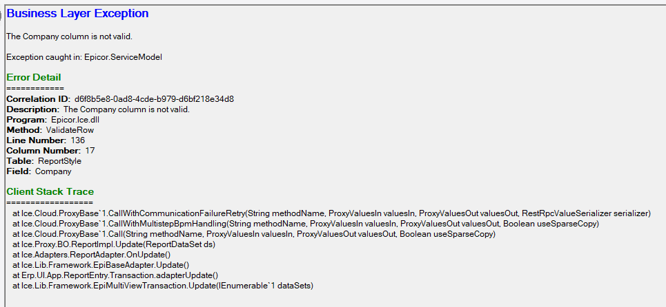 I tried changing my ssrs and upload in report style maintenance and tried save it it show the company column is invalid, can advise me on this?